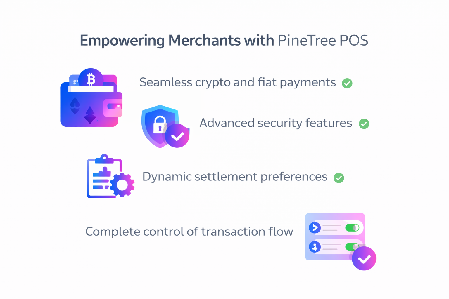 PineTree POS allows businesses to accept digital assets directly at the point of sale. With support for multiple blockchain payment rails, merchants can generate QR payments, confirm transactions in real time, and settle funds according to their preferred workflow, Use with any smart device.